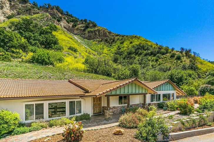 The double-gabled house is set on nearly 6 acres among hills, fields, trees, and flowers at the end of a long private driveway, according to TopTenRealEstateDeals.com. The property includes five bedrooms, a pool, office, barbecue area, and sweeping views of the Ojai Valley, oak trees, evergreens, and year-round flowers.