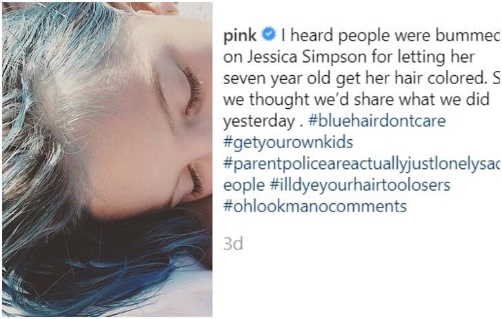 Two days ago, Pink posted a photo of her 8-year-old daughter Willow Sage sporting her freshly-dyed blue hair color. Judging from the photos, the singer herself colored Willow's hair and shared the fact with her 6.6 million followers as a show of support for Simpson.