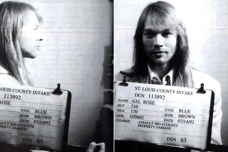 Axl Rose has been arrested over 20 times in his lifetime. This particular mugshot is from 1992, after being arrested for starting a riot during one of his concerts. He was slapped with misdemeanor charges from the riot, charges which were later dropped and Axl walked freely. He ironically stated that he spent his time signing autographs for the police officers in the department. Axl was most recently singing in Rock or Bust World Tour of the band AC/DC as their lead singer and appeared as himself in an episode of the New Looney Tunes in 2018.