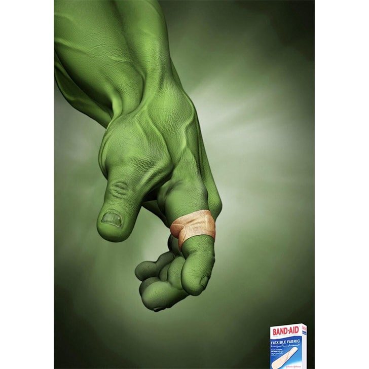 Aside from the obvious, this specific product also promotes something else in a very curious way. It makes the point that even the toughest of people can get hurt and might need a Band-Aid at some point. Also, they specify that their brand fits even one of the Hulk’s huge fingers! Perfect timing, perfect example, and a unique vision.