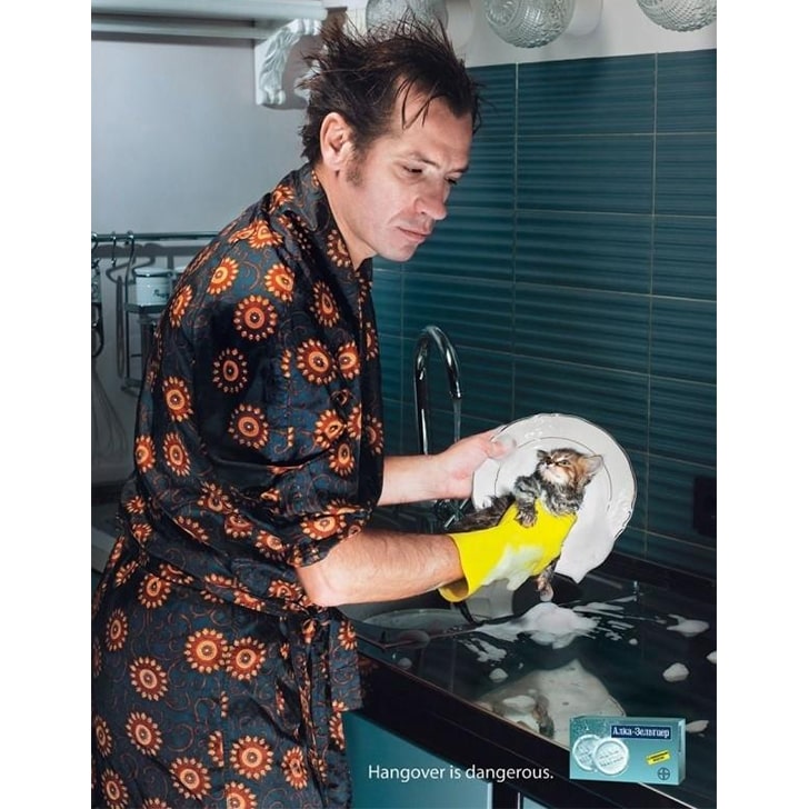 Offering a hangover cure after setting this context is very useful. The exaggeration and absurdity might seem a bit extra, but it works well in an attention-grabbing way. We hope they didn’t use a real cat for this, or they might have to face enraged animal rights activists.