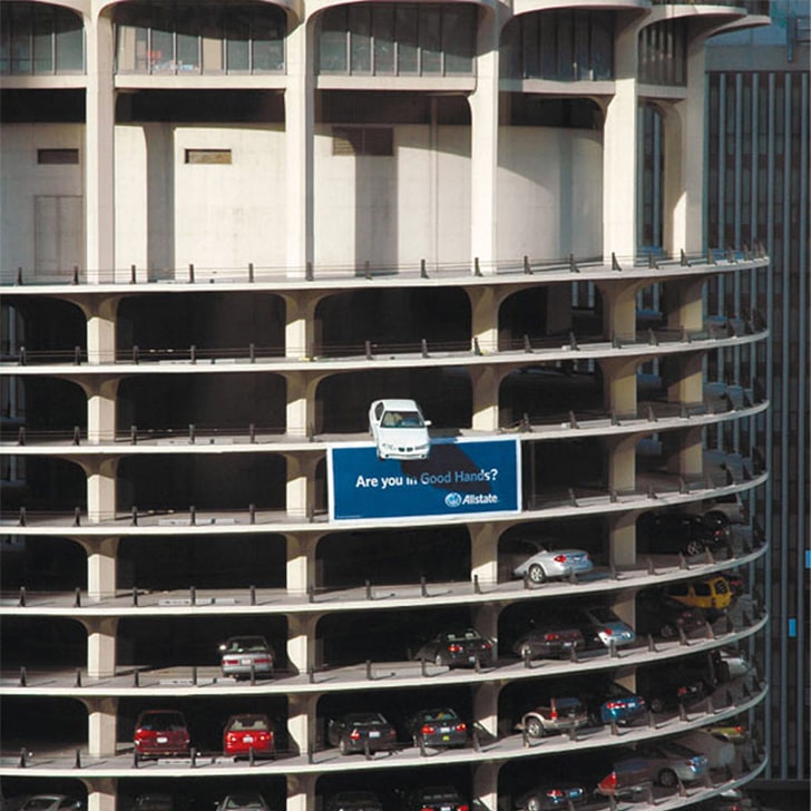 Anyone driving by that first sees this might feel the biggest and most unexpected shock! It looks as if this vehicle is bound to fall and crash. This reaction is what the people of AllState were probably looking for. The real cherry on top of this ad is the location.