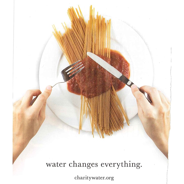 An image as ridiculous as uncooked pasta with sauce is a great way to bring the idea home. Charity: Water hired the right advertiser for sure! The message they're putting out there is not just some abstract idea taking place in a faraway country. It’s something that could affect our capability to cook even the simplest of dishes.