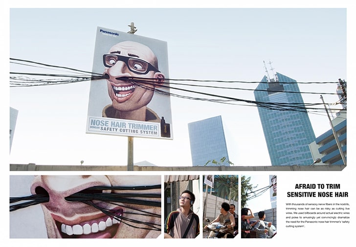 No one really wants to talk about nose hair, and yet, trimmers are a necessity that needs to be advertised! Incorporating cables into this ad and in such an absurd way is just pure genius! It tackles the slight taboo associated with the subject, and it’s impossible to ignore.