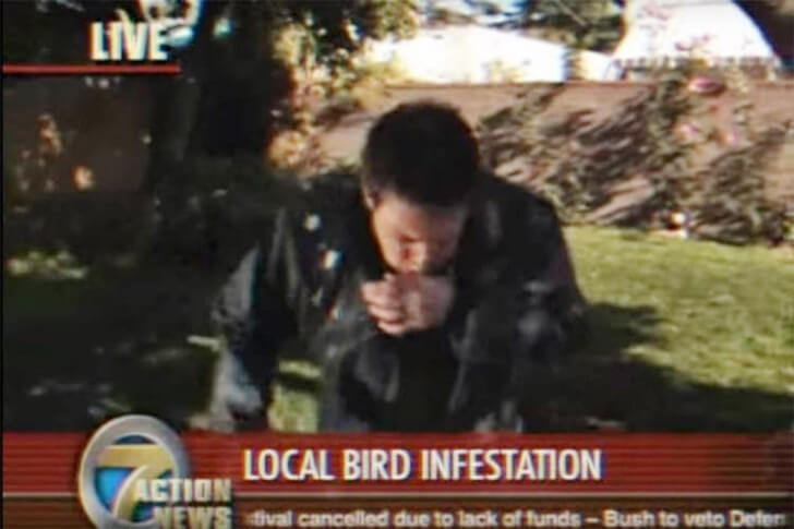 Taking "in-depth" reporting to new, comical heights, anchorman Bob Carr found himself at the mercy of disgruntled birds. Attempting to report on a local bird infestation, Bob placed himself right in the feathered frenzy, unknowingly inviting a barrage of avian artillery. The first sign of attack?