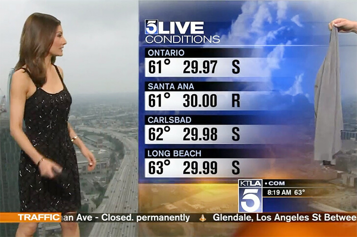 As she moved across the screen, bursts of rain, clouds, and sunspots appeared to engulf her. News anchor Chris Burrous promptly played the knight in shining armor, lending her his coat to restore her visibility. This bizarre fashion gaffe says it all: In TV news, always beware of the green screen's vanishing trick!