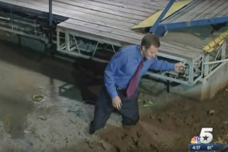 If you thought news reporting was all glossy studios and sharp suits, correspondent Mark Wilkins begs to differ. To illustrate a story about a receding lake, Mark took a daring leap onto what he assumed was a dried lakebed. Instead, he found himself knee-deep in a pit of clingy mud.