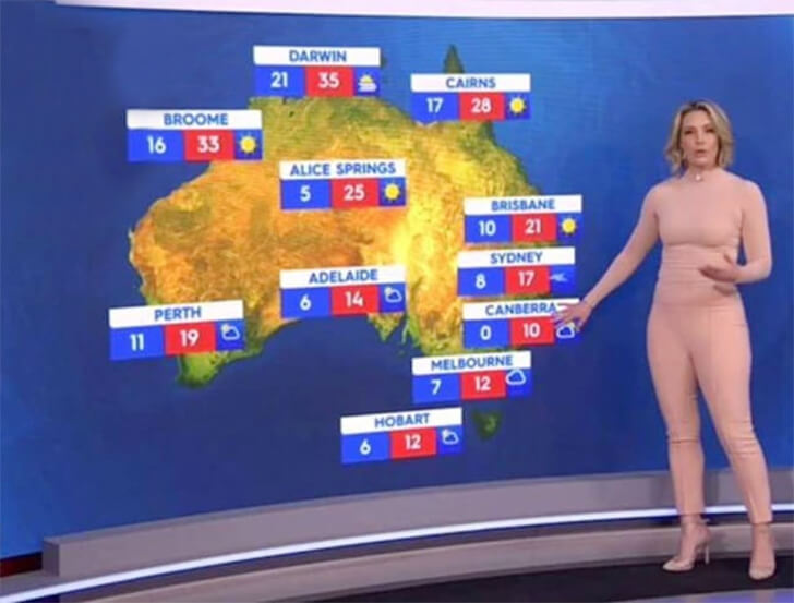 Weather reporter Belinda Russell certainly became the forecast herself when she appeared on-air in a startling flesh-colored bodysuit. Her unique fashion choice caused a double-take across Australia, making her seem almost naked against the studio backdrop. Despite the shocking first impression, viewers soon realized it was a clever illusion, making for a memorable weather report!