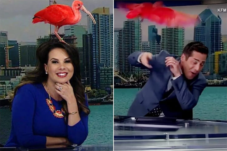 A radiant splash of red disrupted the mundane flow of news when Sophie, a Scarlet Ibis from the San Diego Zoo, decided to gatecrash live TV. Much to viewers' delight, she found a perch on the poised anchor, Medina's head. Handling the situation with aplomb, Medina, ever the professional, continued her broadcast while sporting the colorful 'headgear', occasionally indulging in light-hearted chatter with the unexpected guest.