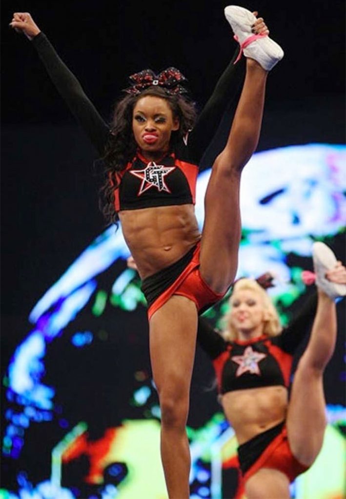 Doch bei diesem Mädchen scheint sowohl das Grinsen als auch die Pompons zu fehlen. Mag sein, dass letztere nicht zur Routine gehörten, aber es gibt wirklich keine Rechtfertigung dafür, das Lächeln einfach wegzulassen. Sicher ist jedenfalls, dass ein Augenzwinkern und Zunge herausstrecken nicht zum Konzept des "Cheer" in Cheerleader passen.
