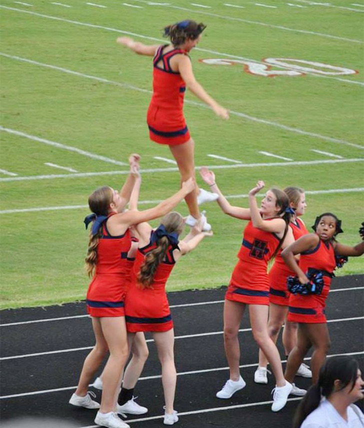 Auf dem Foto ist jeder in der Gruppe damit beschäftigt, den fehlgeschlagenen Versuch einer Pyramide irgendwie zu retten. Das Bild wurde im perfekten Moment aufgenommen, um alles festzuhalten. Traurigerweise scheint es, dass das blonde Mädchen links sich verletzt hat, als sie mit ihrem Gesicht auf den Kopf eines männlichen Cheerleaders knallte. Das muss wehgetan haben!