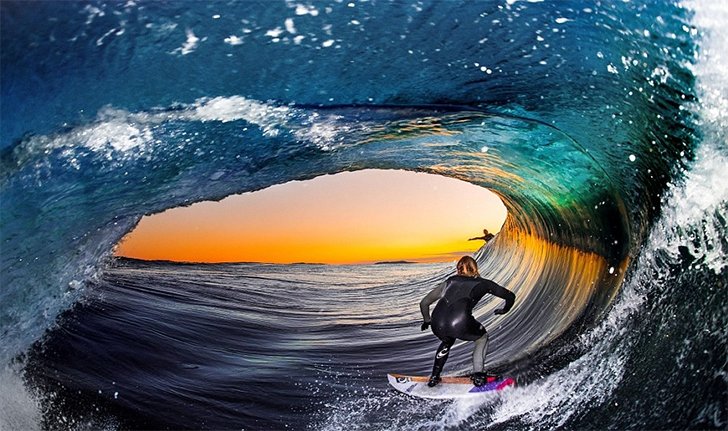 Sonnenuntergänge sind ein häufiges Motiv in der Fotografie, doch das Besondere an diesem Bild ist nicht der Sonnenuntergang selbst, sondern die Art, wie die Welle sich um das Motiv biegt, als ob die Realität sich selbst verbiegen würde. Hat der Fotograf eine GoPro verwendet, um diesen einzigartigen Blickwinkel einzufangen?