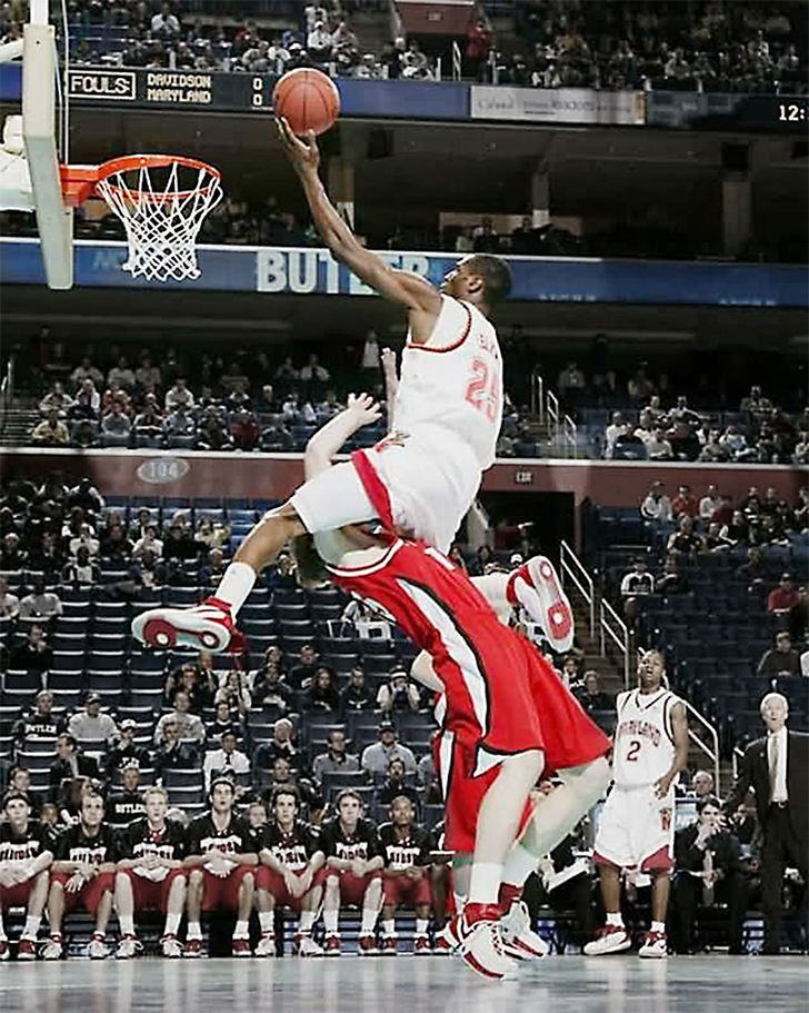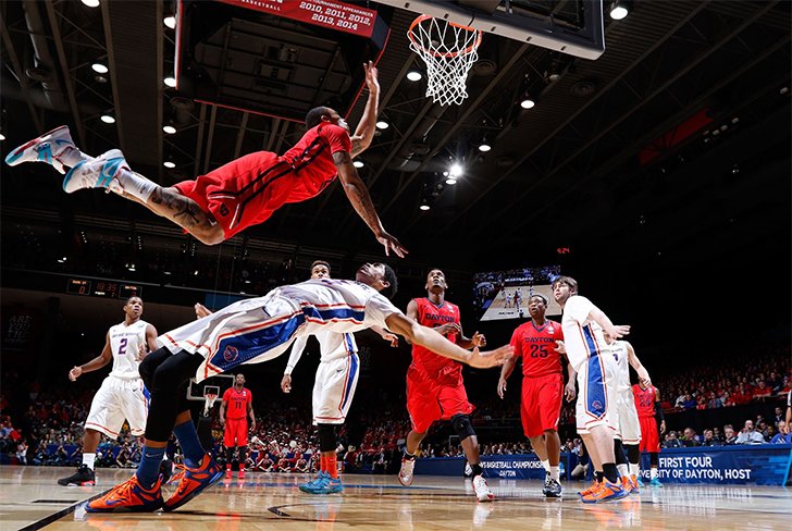 Basketball hat immer wieder Momente, die uns in Erstaunen versetzen, und das Foto aus dem Spiel zwischen Boise State und Dayton im Jahr 2015 ist ein solcher Moment. Kyle Davis von Dayton scheint über Chandler Hutchinson von Boise State hinwegzufliegen – ein beeindruckendes Beispiel für die Athletik und Fitness.