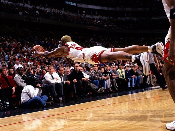 Dennis Rodman ist als Basketballstar bekannt, der sich nicht an die Regeln gehalten hat – aber selbst er konnte die Gesetze der Schwerkraft nicht brechen. Oder konnte er? Ein legendärer Schnappschuss aus einem Match im Jahr 1997 zeigt Rodman, wie er quer in der Luft fliegt, um den Ball vor dem Aus zu retten.