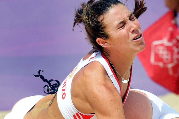 Beim ersten Blick auf das Bild fragst du dich vielleicht, was dort passiert. Es zeigt Elsa Baquerizo, die bekannte spanische Beachvolleyballerin, wie sie im Moment des Zusammenpralls mit ihrer Teamkollegin Liliana Fernández steht.