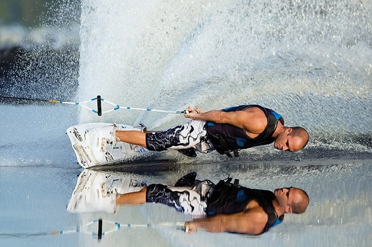 Wakeboarding ist für seine Dynamik und Geschwindigkeit bekannt, doch dieses Bild zeigt eine unerwartete Seite dieses Sports. Der Gesichtsausdruck des Mannes, kombiniert mit der ruhigen Wasseroberfläche, schafft eine Szene von seltener Schönheit und Ruhe. Das Bild ist so perfekt eingefangen, dass die Wasseroberfläche den Sportler spiegelt, wobei das im Hintergrund aufspritzende Wasser dem Ganzen noch einen spektakulären Touch verleiht.