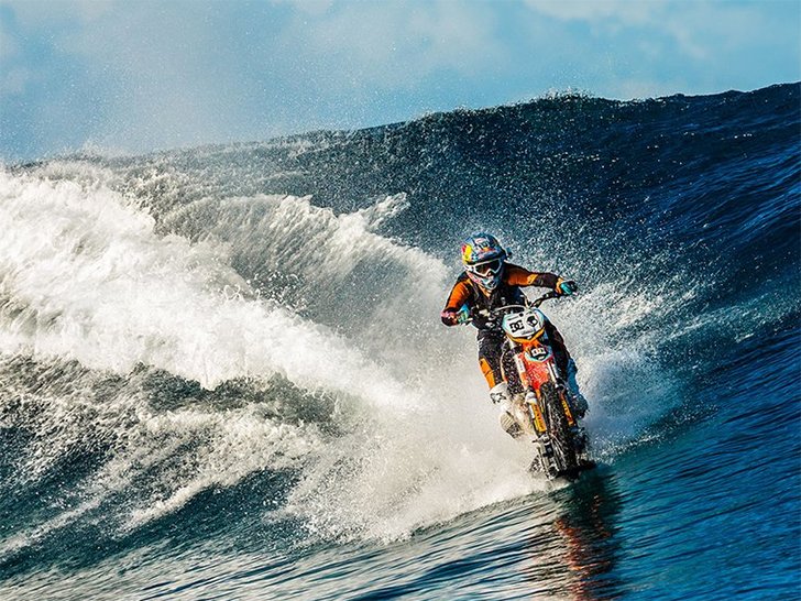 Für diesen unglaublichen Trick wurden zwei Jahre lang geplant und organisiert. Technische Modifikationen am Motorrad, das richtige Timing mit den Wellen und perfekte Bedingungen waren nötig, um dieses Wunder zu vollbringen. Es ist eine Verkörperung von Innovationsgeist und grenzenloser Vorstellungskraft, die das Extreme in beide Sportarten einfängt.