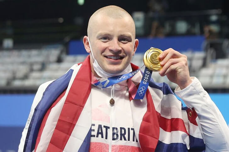 Adam Peaty is one of Britain's greatest male swimmers of all time. Want proof? Just look at that freshly won gold medal in the picture, earned at the 2020 Tokyo Olympics, which were hosted in 2021. This is a repeat of his feat in the 2016 Olympic breaststroke event, where he also won gold.